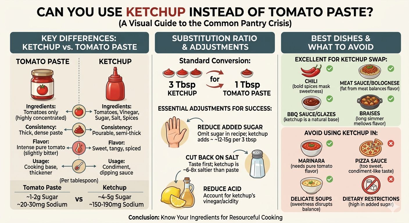 Rasio substitusi standar adalah 3 sendok makan saus tomat untuk setiap 1 sendok makan pasta tomat — tetapi hal ini disertai dengan penyesuaian penting karena saus tomat kurang pekat, lebih manis, dan lebih asam.